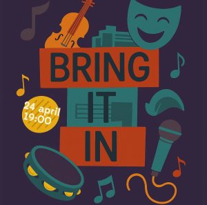 “Bring it in” is een ontspannen avond voor jongeren met een grote interesse voor muziek, theater, kunst, literatuur of performance. Neem iets mee wat jou raakt, inspireert, boeit en waarvan jij denkt: “Dit is zo mooi, ontroerend, lelijk, aangrijpend of komisch, dit moeten mensen weten.”